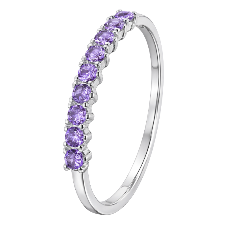 O anel meia aliança em prata 925 com zircônias roxas é uma peça elegante e moderna que une brilho e personalidade. As pedras em tom violeta criam um contraste sofisticado, trazendo charme e exclusividade ao visual.