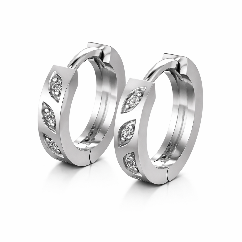 O brinco argola em prata 925 com zircônias apresenta um design elegante com recortes em formato navete, criando um visual moderno e sofisticado.
