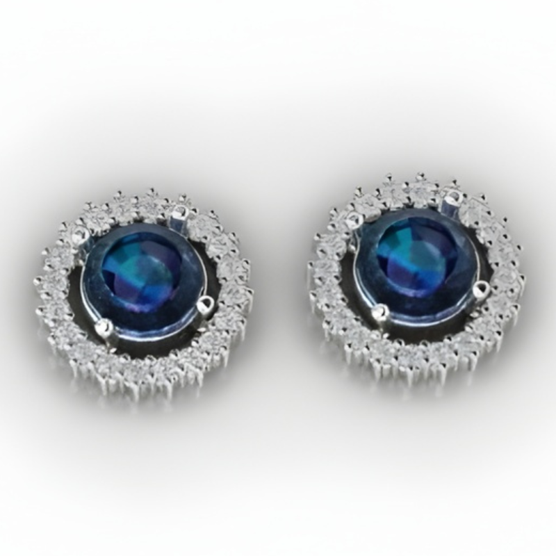 Com uma pedra azul central em destaque, envolvida por um halo de zircônias, o brinco cria um efeito elegante e luxuoso, semelhante a joias finas.