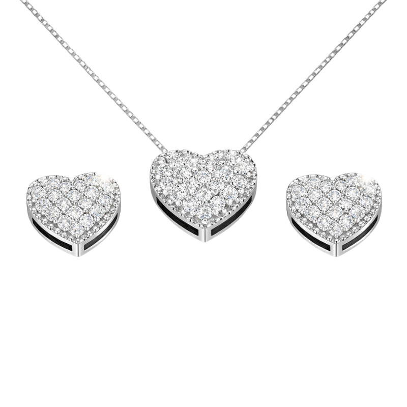 O conjunto coração em prata 925 com zircônias brancas cravejadas é a escolha perfeita para quem busca uma joia delicada, sofisticada e extremamente brilhante. Composto por colar e brincos, ele traz um visual elegante para qualquer ocasião.